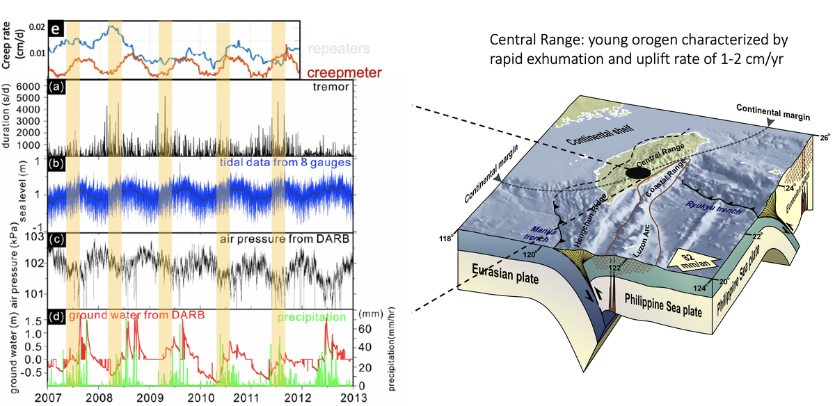 Fluid induced aseismic fault slip: how much we can learn from earthquake swarm and repeating earthquakes? Earthquake swarm and repeating earthquakes are part of the spectrum of aseismic processes that release tectonic stress at depth. Their episodic occurrence in subduction zones has been regarded as an important indicator for stress and fluid pressure cycling. Whether the characteristics of fluid generation and migration is different at different tectonic regimes, and how do they influence earthquake cycle however, remain elusive. The active collisional mountain belt in Taiwan provides an unique opportunity to study the association between fluid-flow system and their impact on various earthquake behavior. Does pore-fluid migration serve as the common generation mechanisms for these three seismic phenomena? In this intern program, you will learn how to (1) search for magnitude greater than 2 swarm and repeating earthquakes in southern Central Range and (2) relocate the earthquakes to extract the possible migration behavior. By quantifying and relocating the aseismic slip driven earthquake activities, we hope to better understand the role of fluid in aseismic slip processes underneath the mountain belt.