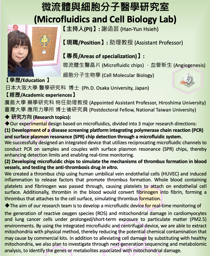 Our laboratory emphasizes interdisciplinary collaboration, integrating approaches from biomedical engineering, molecular biology, and translational medicine. We are committed to training students with both strong experimental skills and critical scientific thinking, preparing them for future careers in biomedical research and biotechnology. Students interested in vascular biology, thrombosis-on-chip systems, environmental health, or multi-cancer disease modeling are particularly encouraged to apply. Prior experience in microfluidic fabrication, cell culture, or bioanalytical techniques will be considered an advantage.