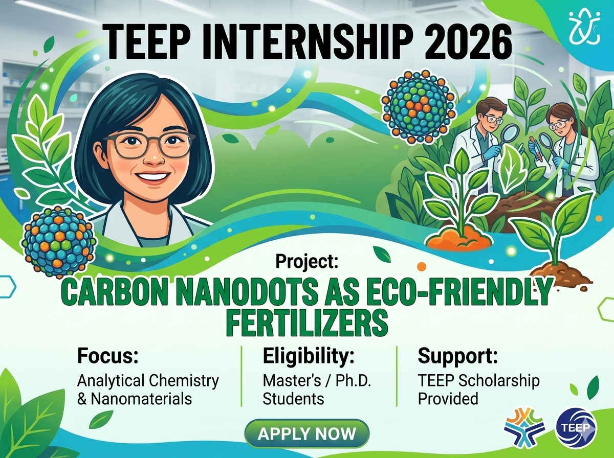 TEEP Internship Recruitment: Sustainable Nanotechnology Project Title: Carbon nanodots derived from coffee bean biomass as eco-friendly fertilizers Project Overview Our research integrates Analytical Chemistry and Nanomaterials to develop innovative solutions for medicine and food safety. We are seeking two motivated interns to join our team for a project focused on the synthesis and application of biomass-derived carbon nanodots. Internship Period Duration: 6 months (July 1st – December 31, 2026) Key Responsibilities Bench-Top Experimentation: Design and synthesize reagents, fabricate nanomaterials, and perform routine spectroscopic characterization (e.g., UV-Vis, fluorimetry, Raman, and Flow Cytometry). Data Analysis: Process experimental data to evaluate and validate the sensitivity, accuracy, and performance of the developed methods. Documentation & Reporting: Maintain systematic lab records and present research progress during weekly group meetings. Academic Publication: Collaborate with the research team to draft and revise high-quality manuscripts for submission to international peer-reviewed journals. Eligibility Applicants must provide proof of current enrollment as a Master’s student or Ph.D. candidate for the entire duration of the internship. Financial Support Successful candidates will receive a scholarship funded by the TEEP program of Taiwan.