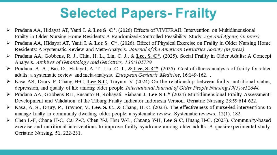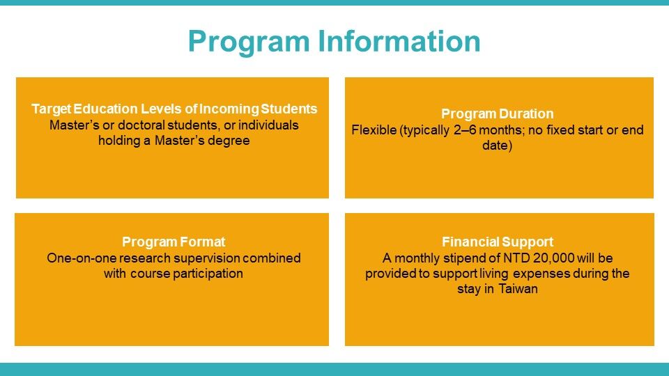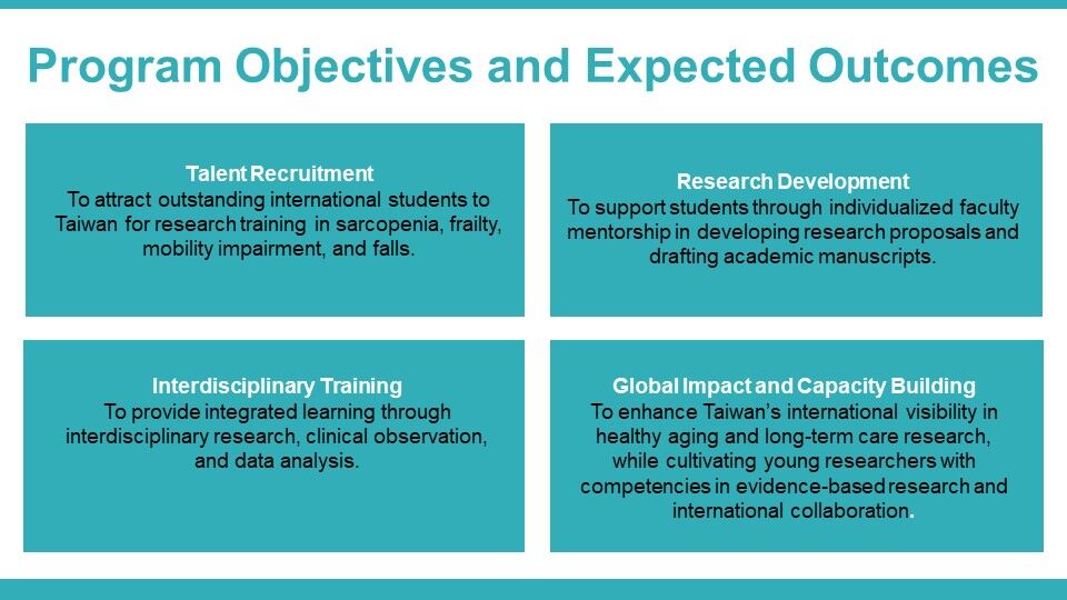 Program Overview: This program aims to establish the SMART Program to attract outstanding international students to Taiwan for research training in sarcopenia, frailty, mobility impairment, and falls. The program integrates interdisciplinary research, clinical observation, and data analysis, with individualized mentorship from faculty members to support participants in developing research proposals or drafting academic manuscripts. Through this initiative, we seek to enhance Taiwan’s international visibility in healthy aging and long-term care research, while cultivating young researchers with competencies in evidence-based research and international collaboration. Eligibility: Applicants from healthcare, public health, or related disciplines are preferred. Candidates should be Master’s or doctoral students, or individuals holding a Master’s degree. Program Details: Recruitment Countries: Open to all countries Duration: 2–6 months (flexible, no fixed start or end date) Format: One-on-one research supervision combined with course participation Financial Support: A monthly stipend of NTD 20,000 will be provided to support living expenses in Taiwan. There is no program fee; however, participants are responsible for their own travel and accommodation expenses. Application Requirements: Interested applicants are required to submit the following via email in advance: 1)Curriculum Vitae 2)A brief research proposal (mini proposal) 3)Proposed period of stay in Taiwan