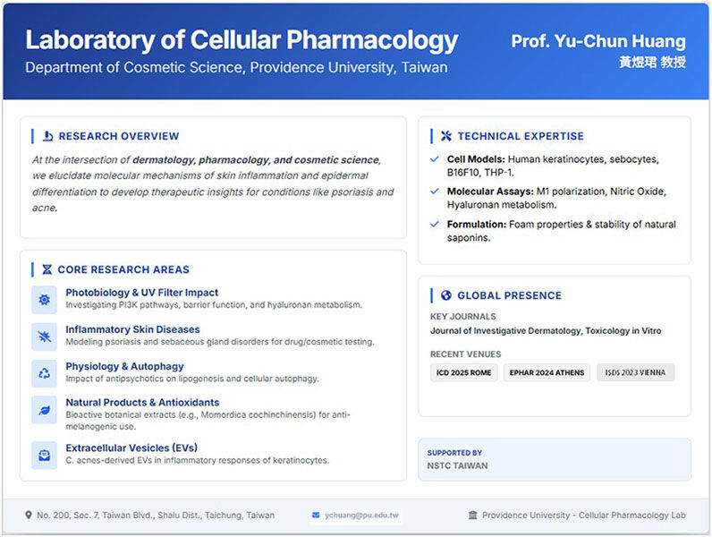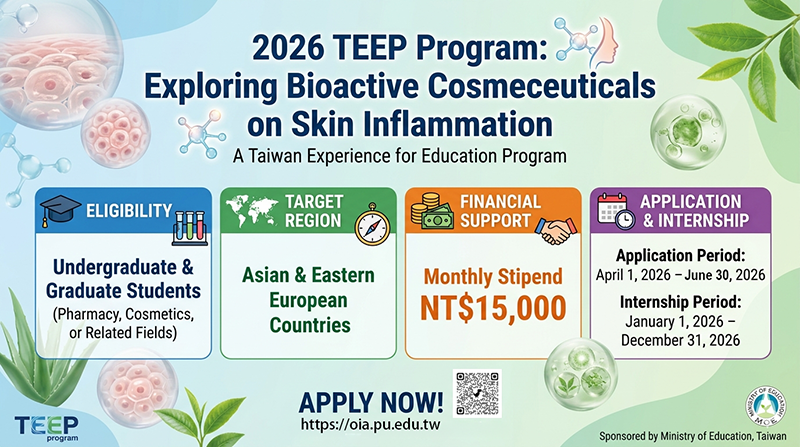 In the process of cosmetic product development, verifying the efficacy of bioactive pharmaceutical ingredients is an important step. This project aims to recruit students from Asian and Eastern European countries to Taiwan to learn how to apply bioactive ingredients in the study of skin inflammatory mechanisms. 1. This program will provide each student with a monthly stipend of NT$15,000 for three to six months. 2. Undergraduate and graduate students majoring in pharmacy, cosmetics, or related fields are welcome to apply. 3. We will assist students in applying for on-campus accommodation.