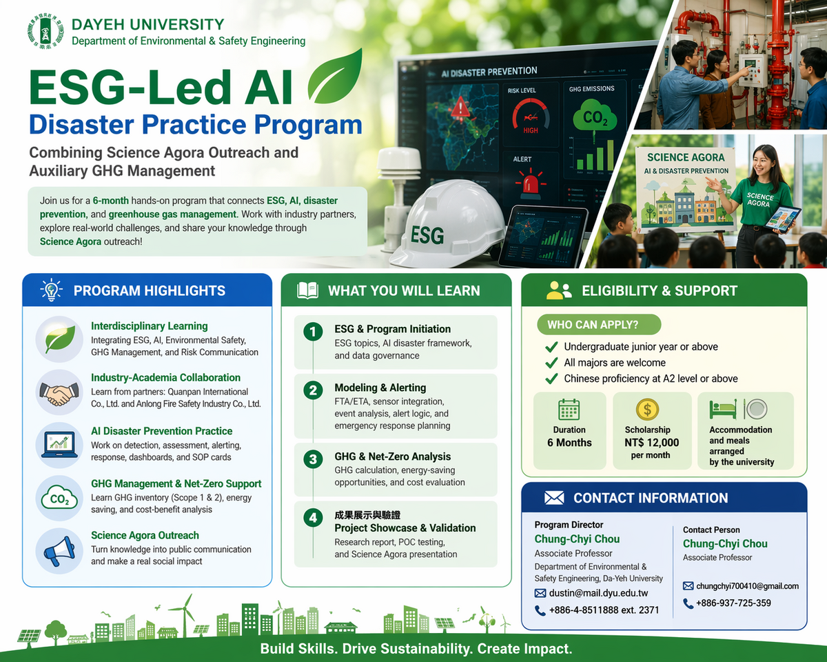 Da-Yeh University invites international students to join a 6-month interdisciplinary program integrating ESG, AI-based disaster prevention, GHG management, and Science Agora outreach. This program offers practical training in sustainability, safety management, and digital applications, while enhancing cross-cultural communication and professional skills.