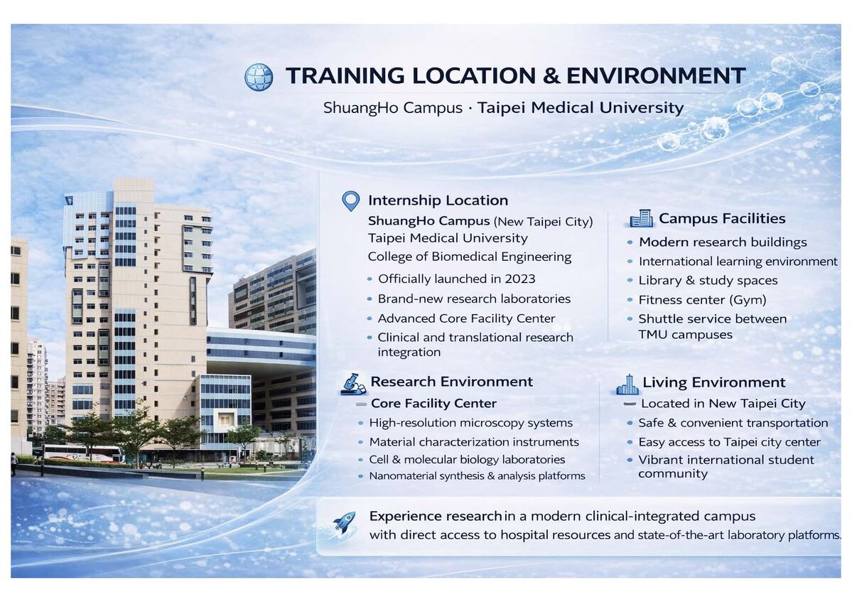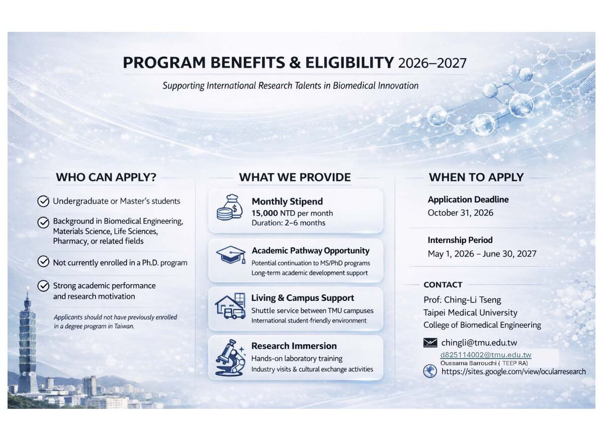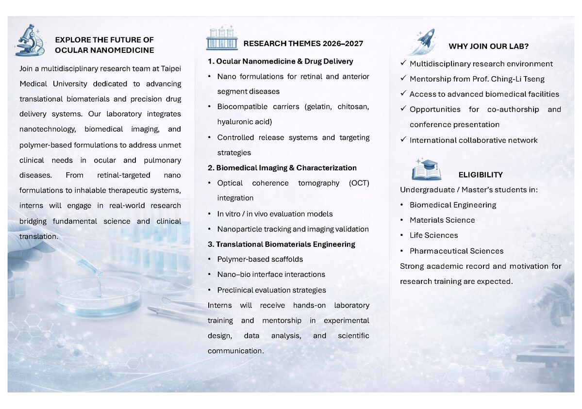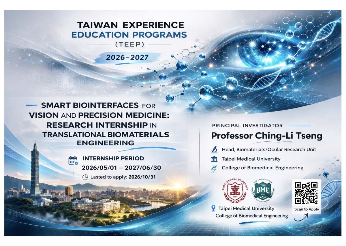 This program aims to train next-generation biomedical innovators in smart biointerface design—integrating biomaterials engineering, nanomedicine, and translational ophthalmic research to advance precision healthcare. By bridging material science and clinical application, the program focuses on developing intelligent, bio-responsive materials and micro/nano-engineered systems that interact dynamically with biological tissues for ocular regeneration and targeted therapy. The overarching mission is to strengthen international collaboration between Taipei Medical University (TMU) and global academic and industrial partners through structured research training and mentorship. Participants will gain hands-on experience in transforming laboratory discoveries into translational innovations addressing vision-related and systemic diseases such as retinal degeneration and corneal injury.