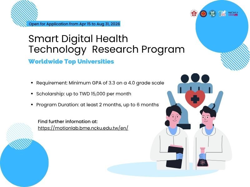 【Program Overview】 The Smart Digital Health Technology Research Program seeks to foster elite collaboration in precision health and medical innovation. We extend a warm invitation to students from worldwide top universities, especially in Thailand, to engage in research internships at NCKU in Taiwan, with the additional option to pursue further graduate studies. This program aims to nurture highly capable talents with international research capabilities, effectively addressing the global demand for experts in smart healthcare and precision medicine.